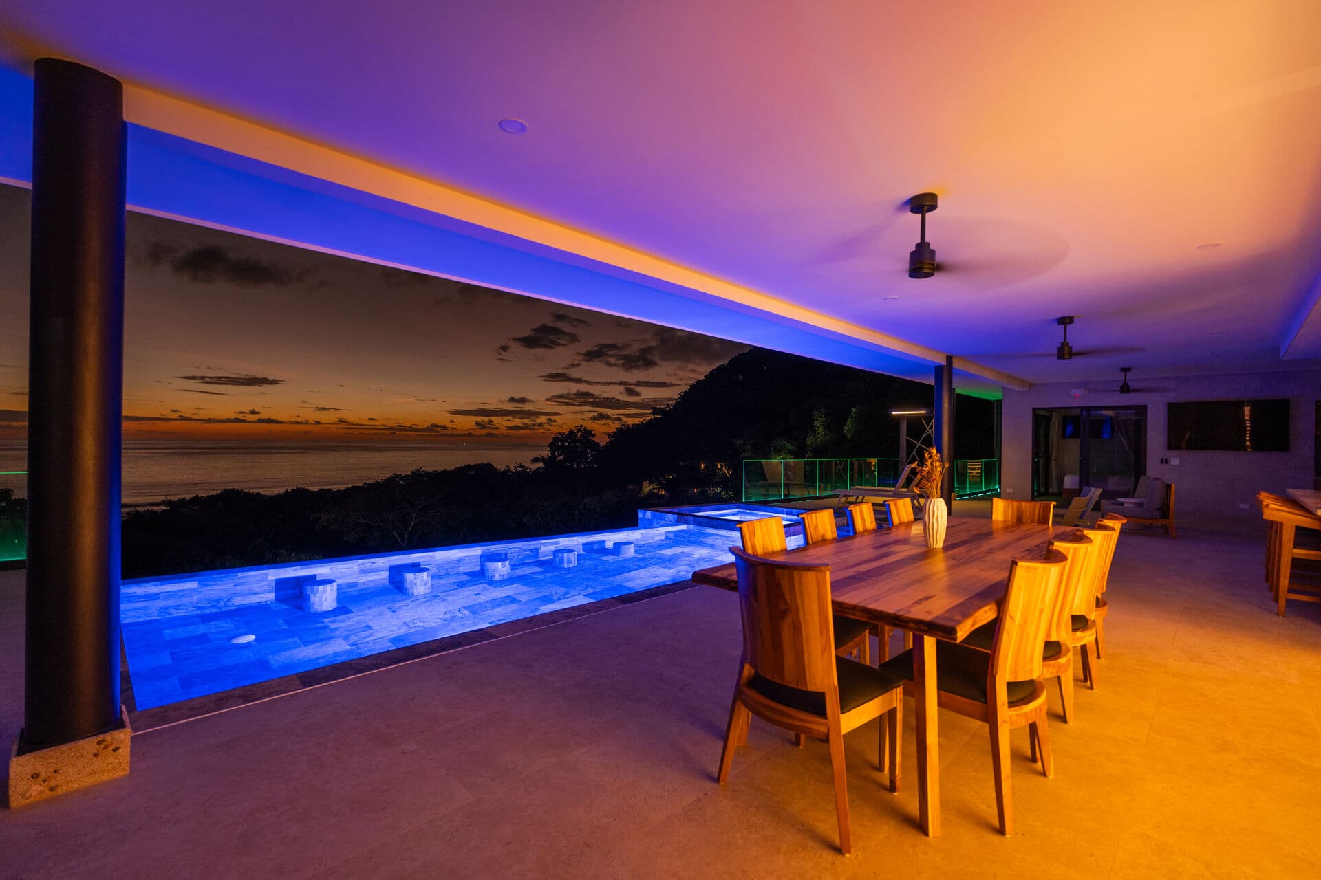 A fully stocked bar and professional pool table. Entertainment without ever leaving the property. Open-air, ocean-facing, designed for long evenings.
